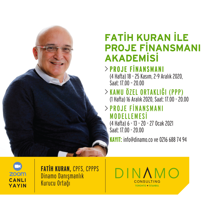 Dinamo Danışmanlık Kurucu Ortağı, Kamu Özel Ortaklığı (PPP) ve Proje Finansmanı Uzmanı Fatih Kuran, Kasım 2020’den Ocak 2021’e kadar toplam 9 hafta sürecek Proje Finansmanı Akademisi programı ile yatırım projeleri için kritik önem taşıyan konuları Zoom üzerinden canlı olarak katılımcılarla paylaşacak. Akademi programında Proje Finansmanı, Kamu Özel Ortaklığı (PPP) ve Proje Finansmanı Modellemesi konuları 3 ana başlıkta toplanacak ve bu konular ile ilgili tüm detaylar masaya yatırılacak